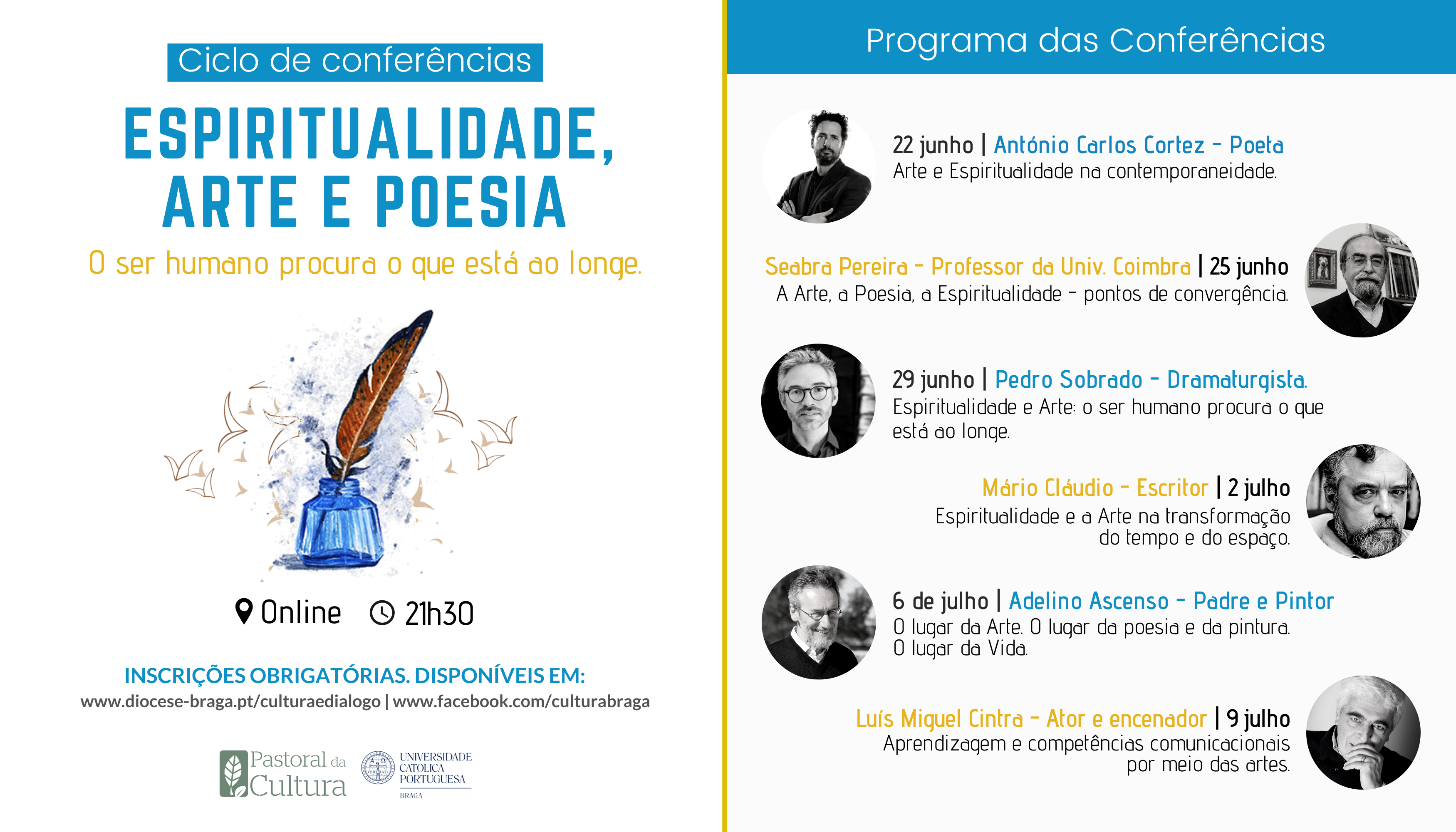 O 'Espiritualidade, Arte e Poesia' será inaugurado já no próximo dia 22 de junho com o Poeta António Carlos Cortez, que refletirá sobre a Arte e Espiritualidade na contemporaneidade. Seguido do diretor do Secretariado Nacional da Pastoral da Cultura, Professor Seabra Pereira, da Faculdade de Letras da Universidade de Coimbra, que apresentará, no dia 25 de junho, Os pontos de convergência na Arte, na Poesia e na Espiritualidade.