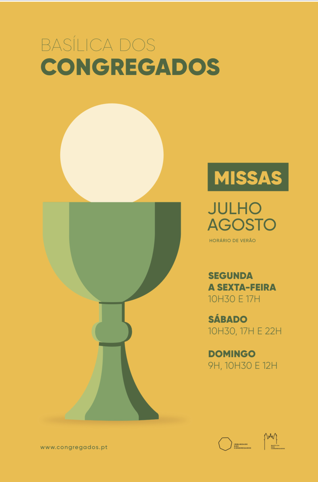 Durante o mês de Agosto, de segunda a sábado, não há a celebração da eucaristia das 12h, permanecendo a das 10h30 e 17h. Horário das Confissões no mês de Agosto. De manhã: das 9h30 às 10h25; de tarde: das 15h30 às 16h30