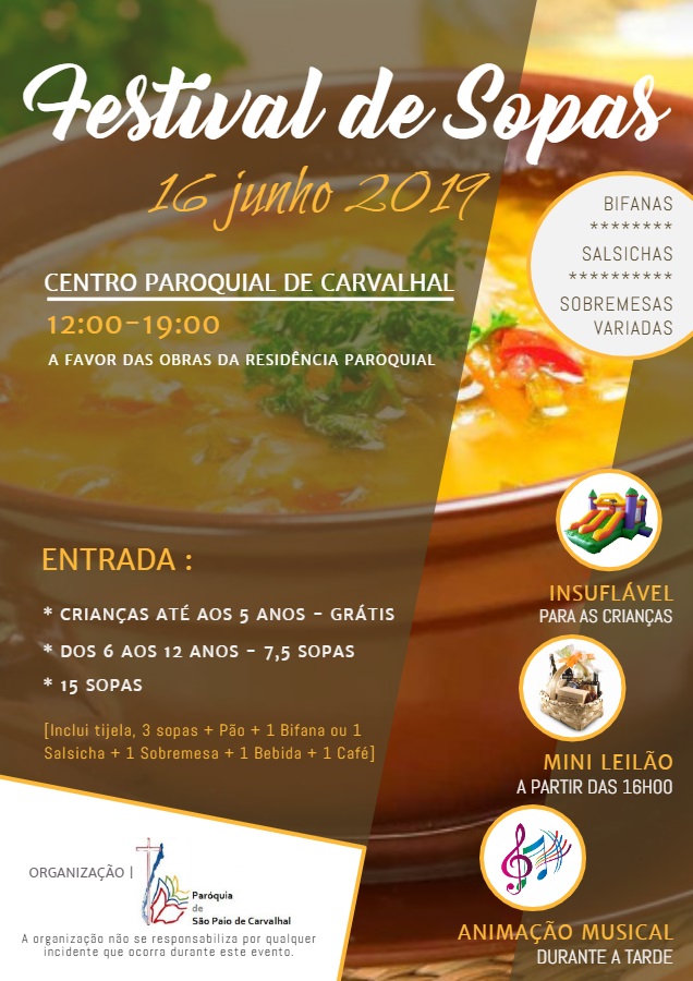 14 junho 2019 Notícia A. Paróquia de Carvalhal organiza Festival de Sopas As sopas do Festival serão confeccionadas pelos grupos e movimentos da Paróquia de Carvalhal.