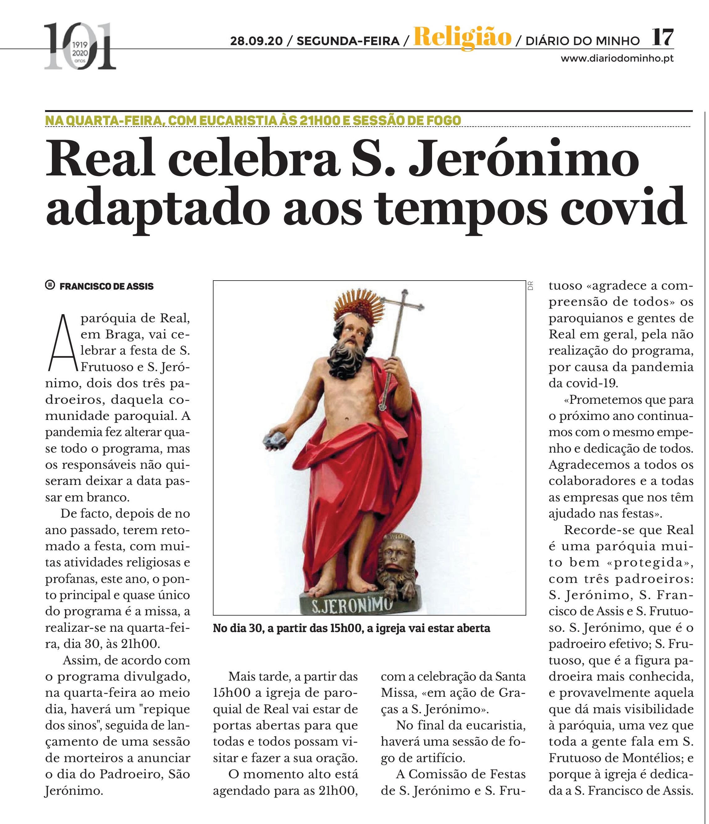 Diário Do Minho 29 setembro 2020 Notícia A. Dia de S. Jerónimo e S.Frutuoso Festa dos padroeiros da paróquia de S. Jerónimo de Real