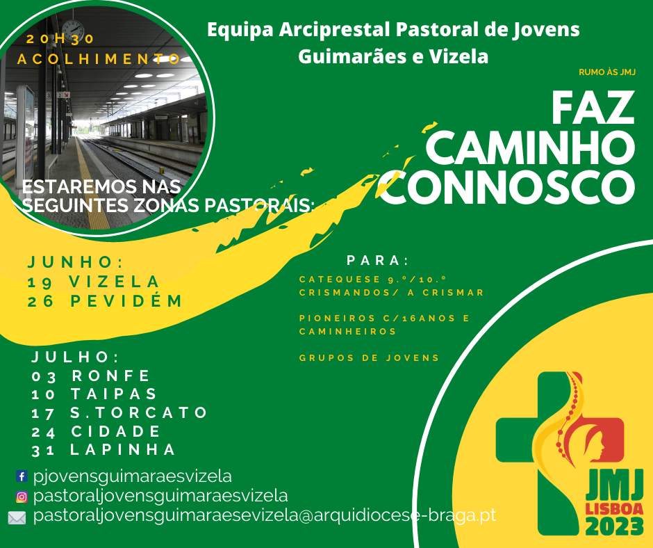 A pastoral dos Jovens do Arciprestado Guimarães e Vizela realiza, no sábado dia 26 de junho, um encontro de apresentação: da equipa e do programa. LOCAL: Salão Paroquial de São Cristóvão de Selho