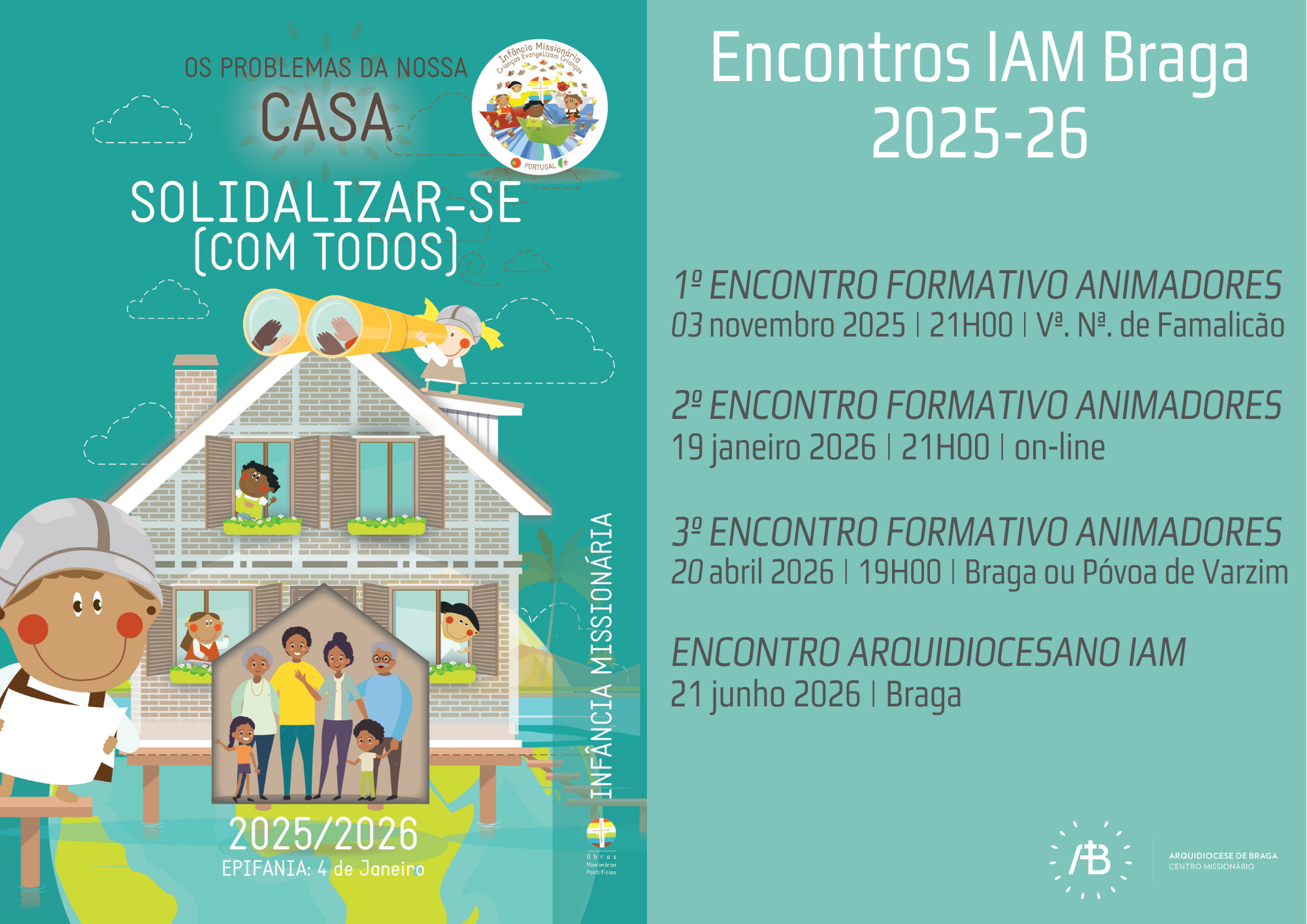 O CMAB - Centro Missionário da Arquidiocese de Braga - convida animadores/as e futuros animadores/as da IAM – Infância e Adolescência Missionária, catequistas e outros animadores de grupos de crianças e adolescentes para participar no encontro formativo de animadores missionários, com o Pe. Amaro Ferreira, da Sociedade Missionária da Boa Nova, com o Tema “Espiritualidade na IAM”. Este encontro será no dia 19 de janeiro 2026, às 21h00, on-line.