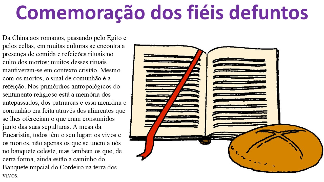 Da China aos romanos, passando pelo Egito e pelos celtas, em muitas culturas se encontra a presença de comida e refeições rituais no culto dos mortos; muitos desses rituais mantiveram-se em contexto cristão. Mesmo com os mortos, o sinal de comunhão é a refeição. Nos primórdios antropológicos do sentimento religioso está a memória dos antepassados, dos patriarcas, e essa memória e comunhão era feita através dos alimentos que se lhes ofereciam, que eram consumidos junto das suas sepulturas. À mesa da Eucaristia, todos têm o seu lugar: os vivos e os mortos, não apenas os que se unem a nós no banquete celeste, mas também os que, de certa forma, ainda estão a caminho do Banquete nupcial do Cordeiro na terra dos vivos.