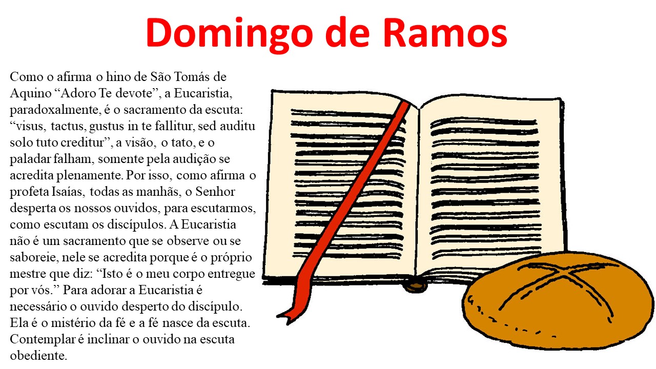 Como o afirma o hino de São Tomás de Aquino “adoro Te devote”, a Eucaristia, paradoxalmente, é o sacramento da escuta: “visus, tactus, gustus in te fallitur, sed auditu solo tuto creditur” (a visão, o tato e o paladar falham, somente pela audição se acredita plenamente). Por isso, como afirma o profeta Isaías, todas as manhãs, o Senhor desperta os nossos ouvidos, para escutarmos, como escutam os discípulos. A Eucaristia não é um sacramento que se observe ou se saboreie, nele se acredita porque é o próprio mestre que diz: “isto é o meu corpo entregue por vós”. Para adorar a Eucaristia é necessário o ouvido desperto do discípulo. Ela é o mistério da fé e a fé nasce da escuta. Contemplar é inclinar o ouvido na escuta obediente.