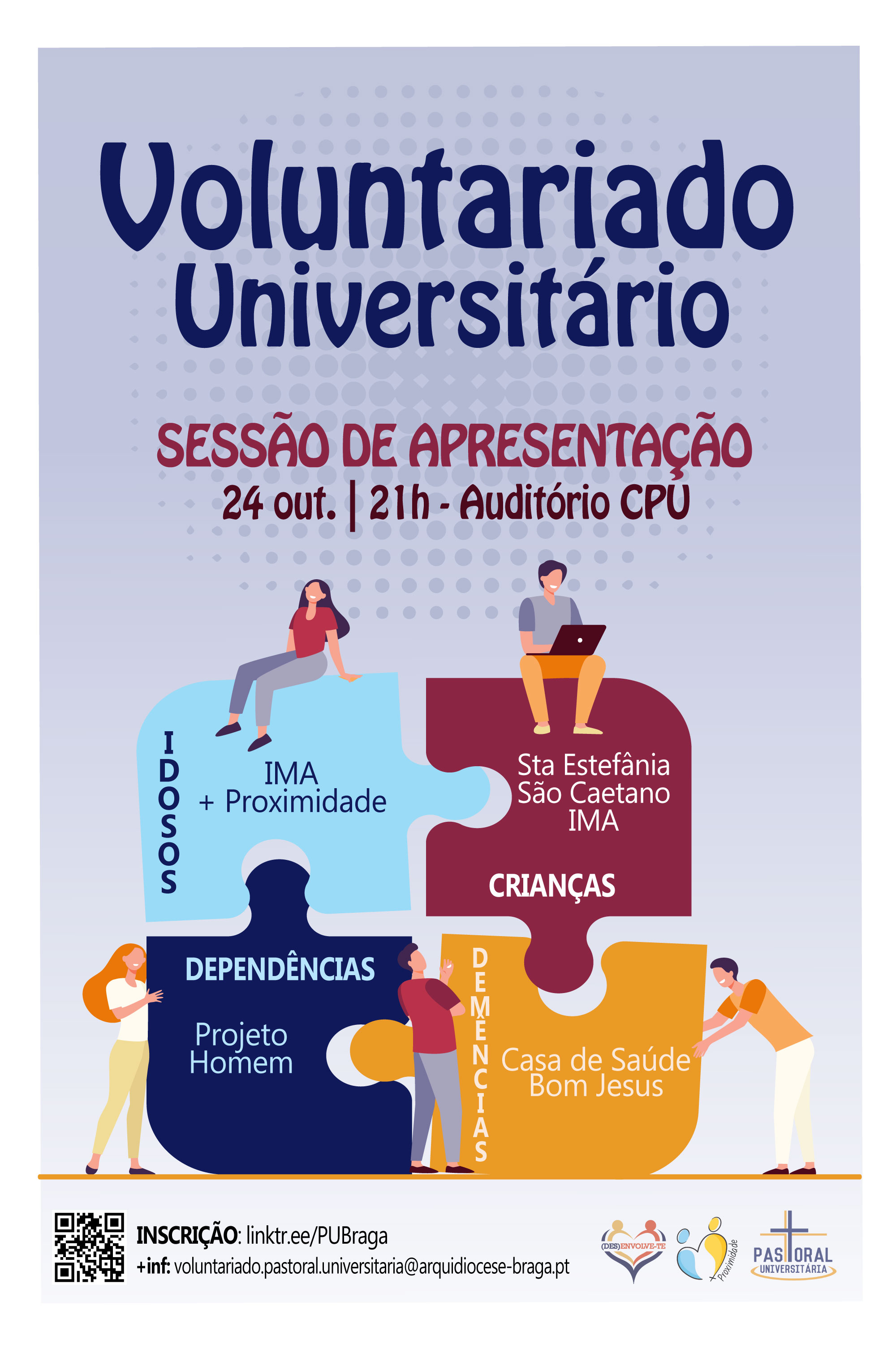 Para os estudantes que desejam conhecer melhor os trabalhos desenvolvidos em alguns setores da Arquidiocese e como contribuir para a vida da comunidade, a Pastoral Universitária de Braga (PUB) preparou uma sessão de apresentação do Voluntariado Universitá