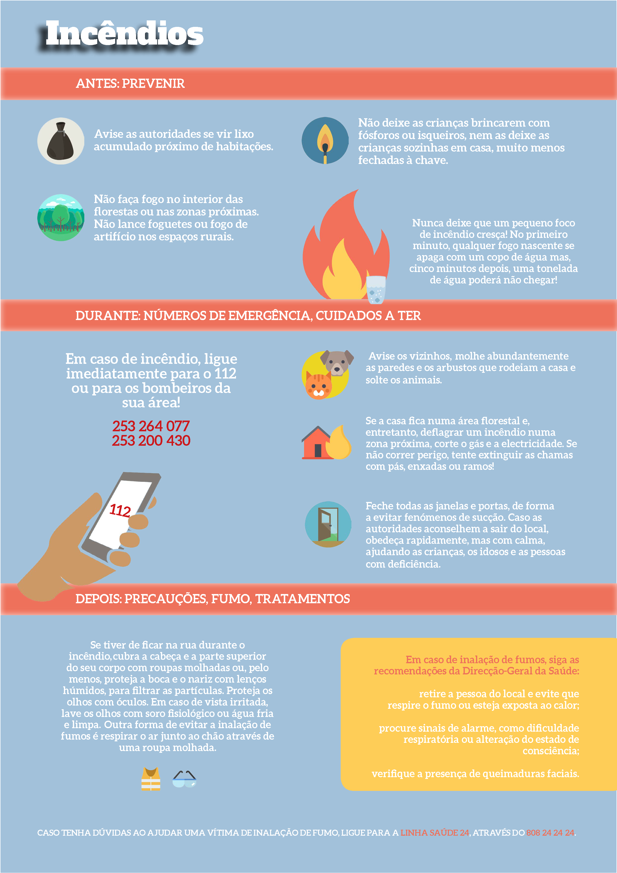 - Caso tenha dúvidas ao ajudar uma vítima de inalação de fumo, ligue para a linha Saúde 24, através do 808 24 24 24, ou procure uma unidade de saúde.