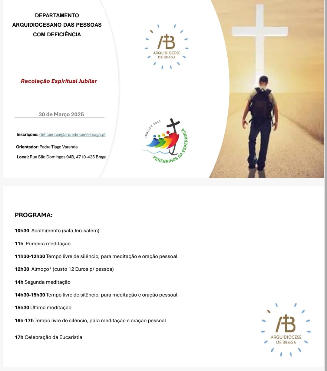 O Departamento das Pessoas com Deficiência convida todas as pessoas com deficiência e seus cuidadores a participar numa recoleção espiritual, que se realizará no próximo dia 30 de março, no Espaço Vita.
