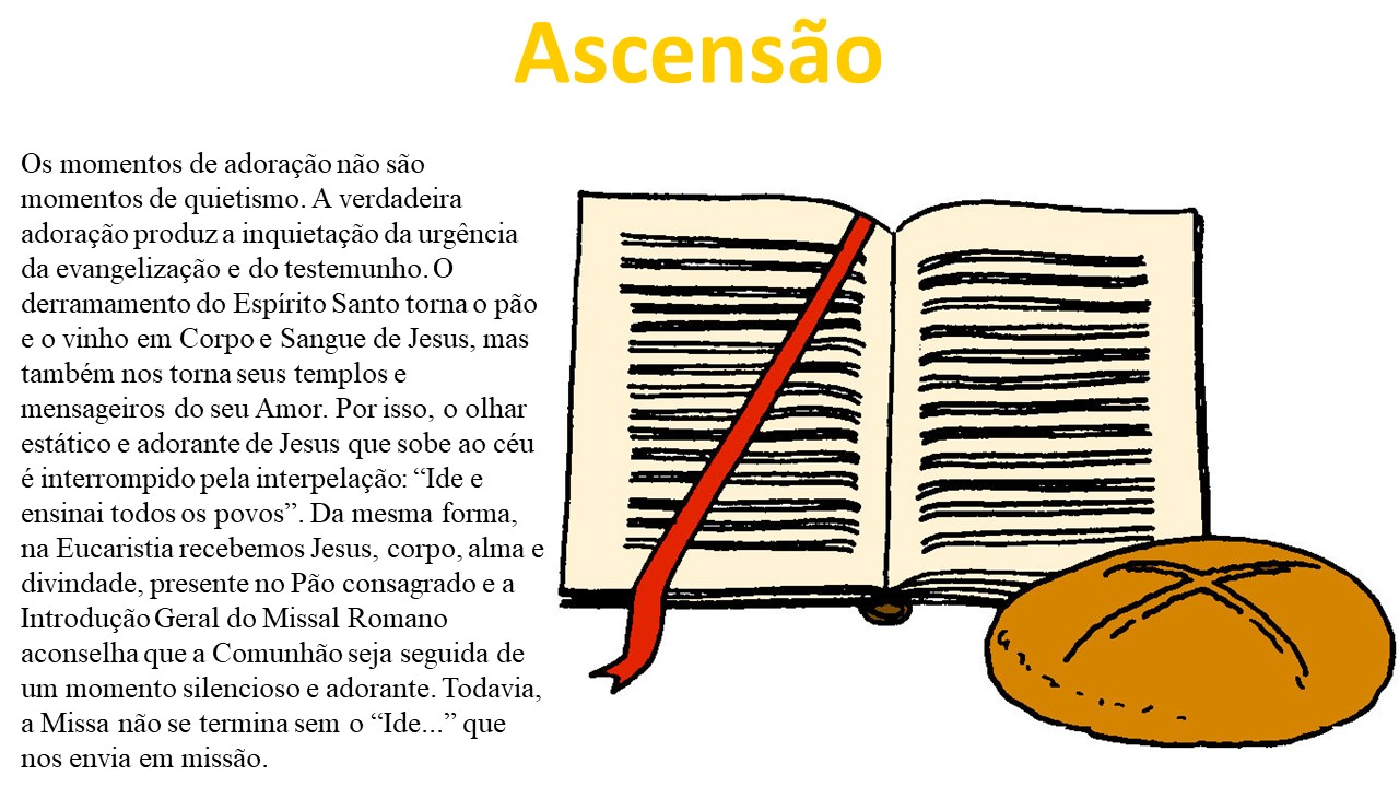 Os momentos de adoração não são momentos de quietismo. A verdadeira adoração produz a inquietação da urgência da evangelização e do testemunho. O derramamento do Espírito Santo torna o pão e o vinho em Corpo e Sangue de Jesus, mas também nos torna seus templos e mensageiros do seu amor. Por isso, o olhar estático e adorante de Jesus que sobe ao céu é interrompido pela interpelação: “ide e ensinai todos os povos”. Da mesma forma, na Eucaristia recebemos Jesus, corpo, alma e divindade, presente no Pão consagrado e a Introdução Geral do Missal Romano aconselha que a Comunhão seja seguida de um momento silencioso e adorante. Todavia, a Missa não termina sem o “ide...”, que nos envia em missão.