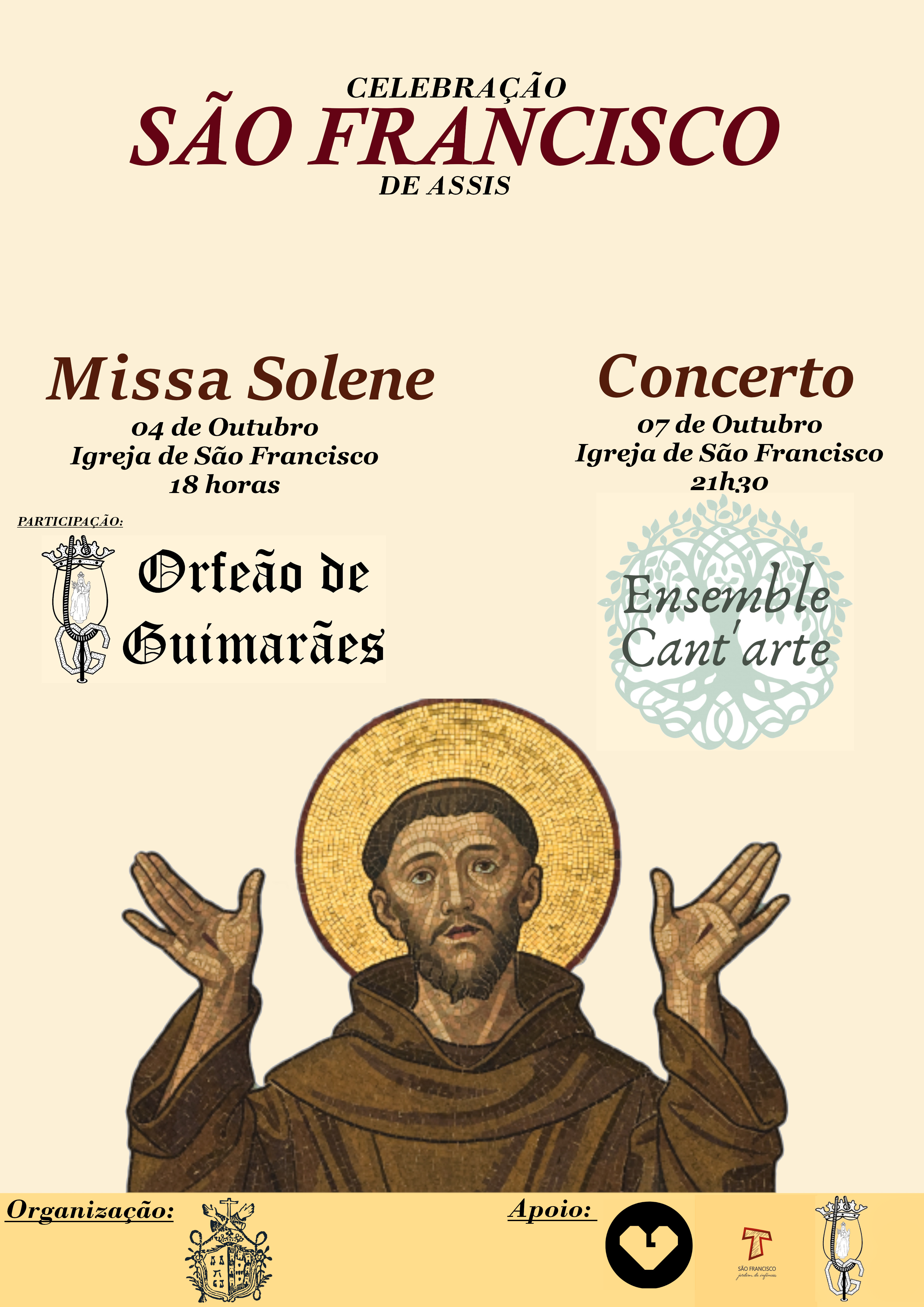 A Missa Solene decorre no dia 4 de Outubro pelas 18h na Igreja de São Francisco e conta com a participação do Orfeão de Guimarães.