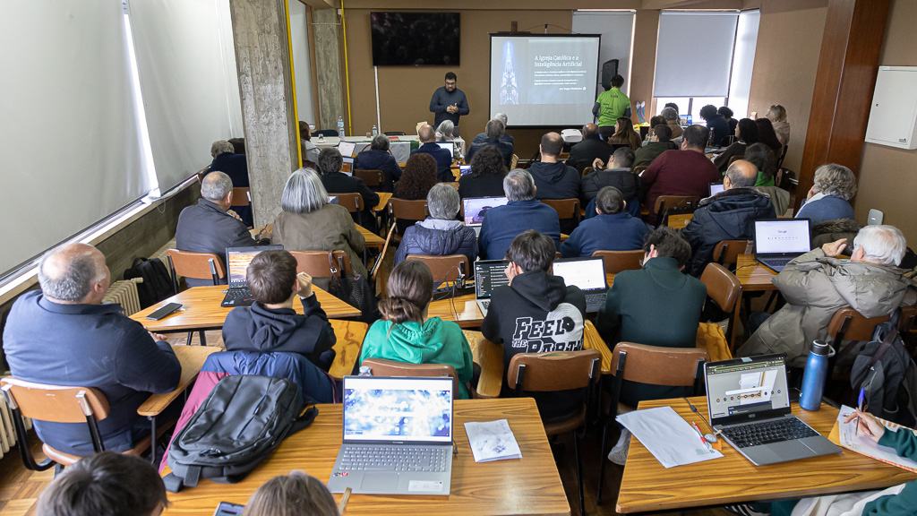 Após o almoço, a programação retomou com uma sessão sobre "Inteligência Artificial", conduzida por Roger Madureira. Foram apresentadas as diversas ferramentas que poderão ser uma mais-valia no desenvolvimento dos nossos trabalhos, além de uma reflexão e consciencialização para o bom uso destas ferramentas. À luz da DSI (Doutrina Social da Igreja), a Inteligência Artificial deve ser norteada para a dignidade da pessoa humana, para o bem comum, ao destino universal dos bens, à subsidiariedade e solidariedade.