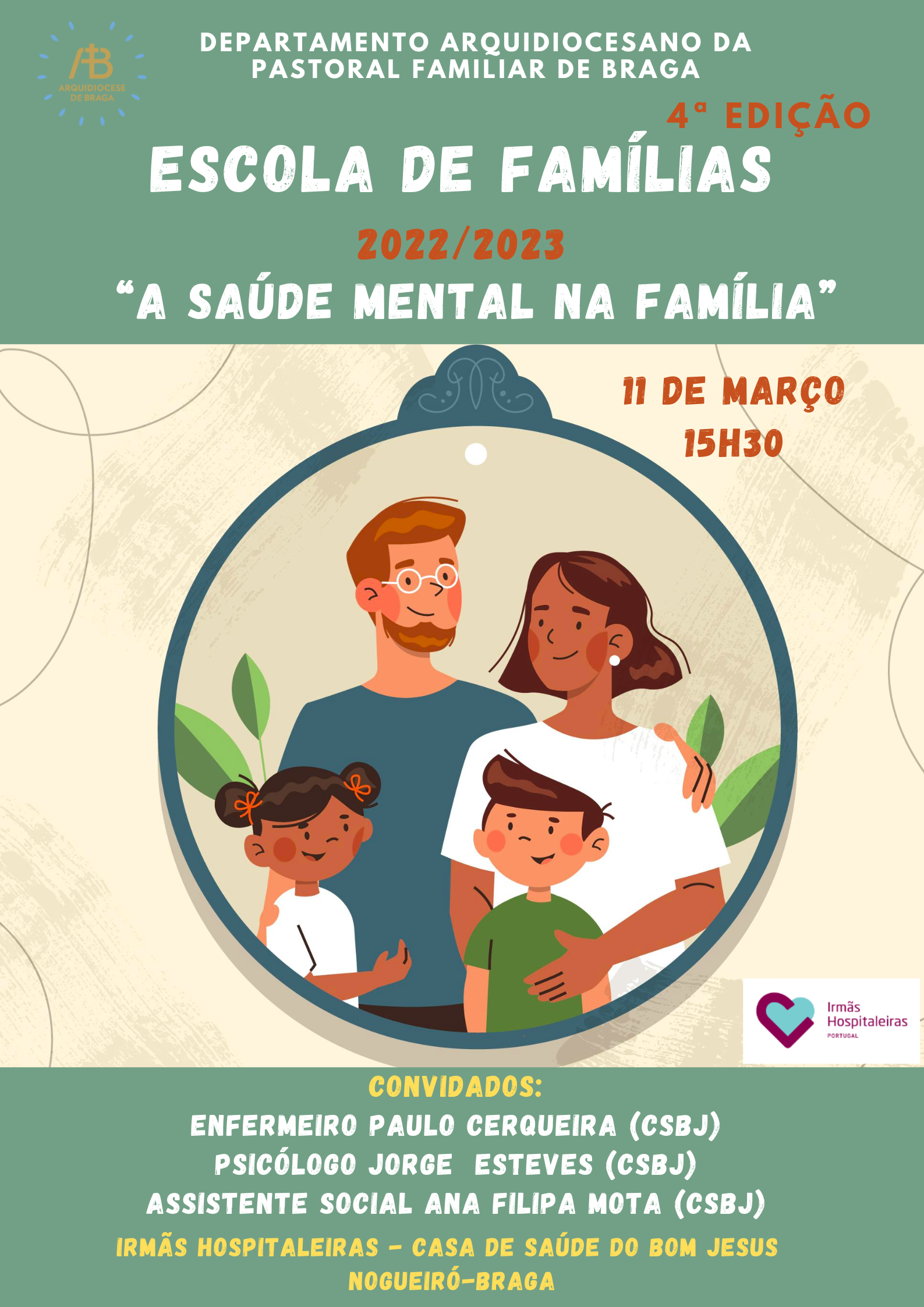 A sessão, em formato de tertúlia, terá lugar no próximo dia 11 de março (sábado), às 15h30, nas IRMÃS HOSPITALEIRAS - Casa de Saúde do Bom Jesus (Nogueiró, Braga). A abordagem do tema terá como dinamizadores o Enfermeiro Paulo Cerqueira, o Psicólogo Jorge Esteves, e a Assistente Social Ana Filipa Mota, colaboradores desta instituição. A moderação estará a cargo do Pe. Jorge Vilaça.